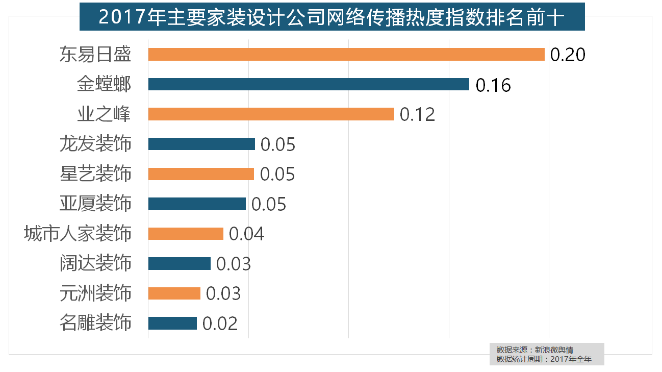 据新浪微舆情对我国次要互联网家拆平台大数据阐发显示,2017年,正在次要家拆产物类别热度方面,金螳螂、业之峰、龙发粉饰、星艺粉饰紧随其后。欧派橱柜的收集热度指数较着高于其他橱柜品牌位列首位,盼盼木门、圣象、美心木门、王力、华鹤紧随其后!